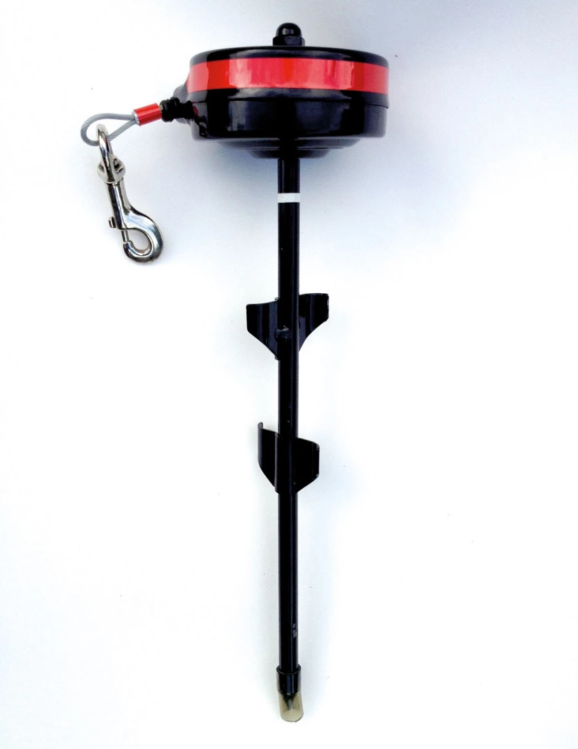 Zware metalen bodempin van Petstages die 360 graden kan roteren en een oprolbare staalkabel heeft waaraan de hond aangelijnd kan worden zodat de hond toch genoeg bewegingsvrijheid heeft en veilig vast zit.